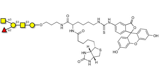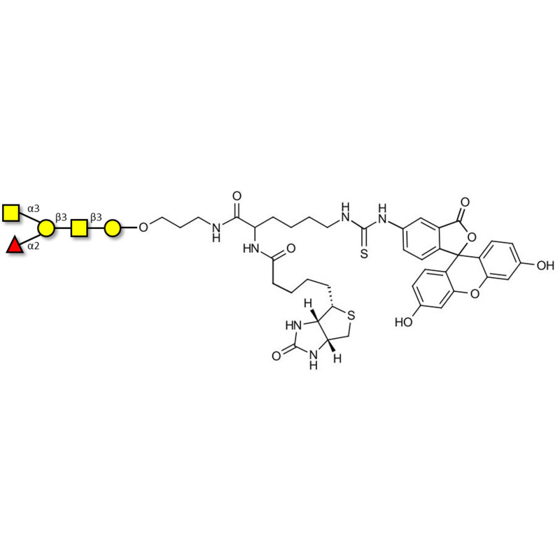 Glycan structure: GalNAcα1-3(Fucα1-2)Galβ1-3GalNAcβ1-3Gal-O-(CH2)3-NHCO-CH(NHCO-Biotin)-(CH2)4-NH-CS-NH-FITC