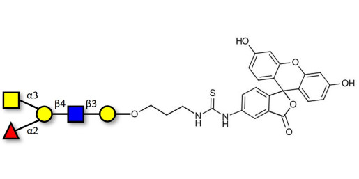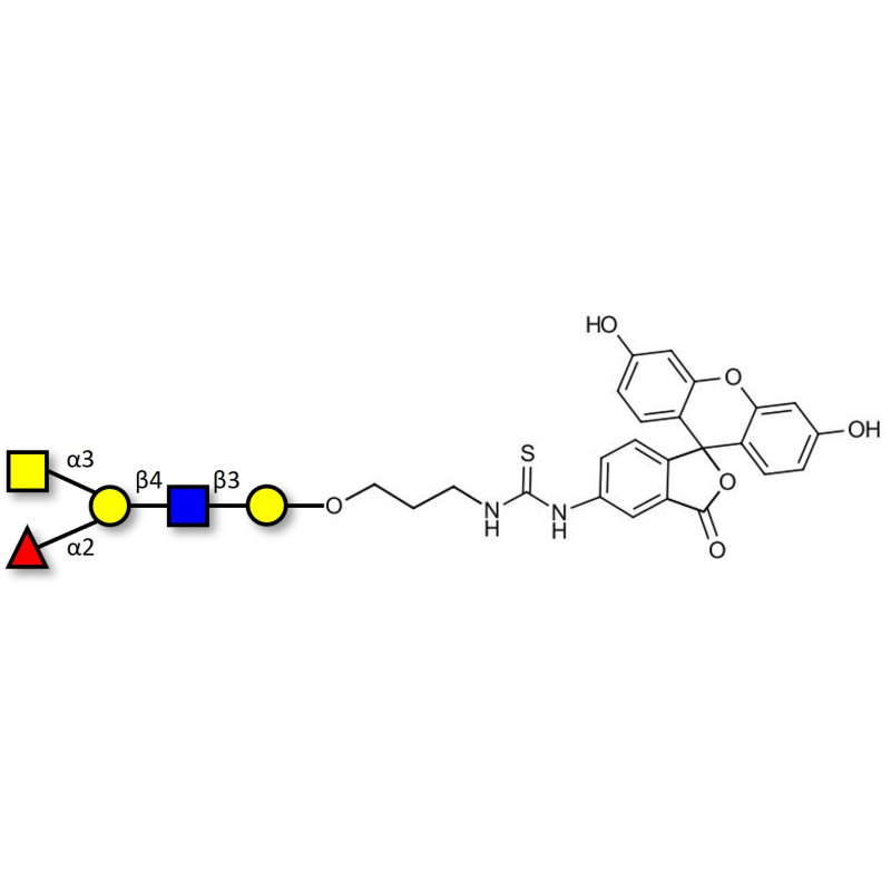 Glycan structure: GalNAcα1-3(Fucα1-2)Galβ1-4GlcNAcβ1-3Gal-O-(CH2)3-NH-CS-NH-Fluorescein