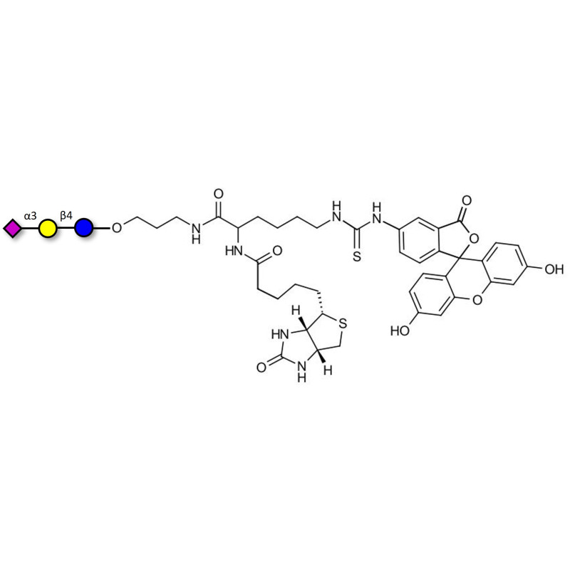 Glycan structure: Neu5Acα2-3Galβ1-4Glc-O-(CH2)3-NHCO-CH(NHCO-Biotin)-(CH2)4-NH-CS-NH-FITC