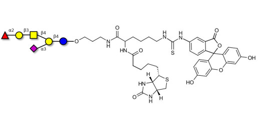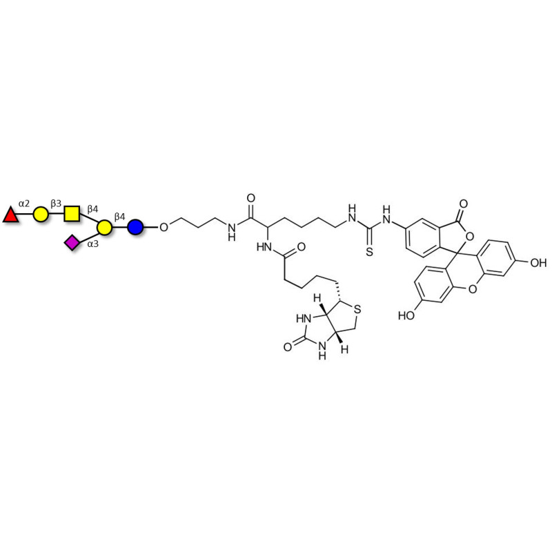 Glycan structure: Fucα1-2Galβ1-3GalNAcβ1-4(Neu5Acα2-3)Galβ1-4Glc-O-(CH2)3-NHCO-CH(NHCO-Biotin)-(CH2)4-NH-CS-NH-FITC