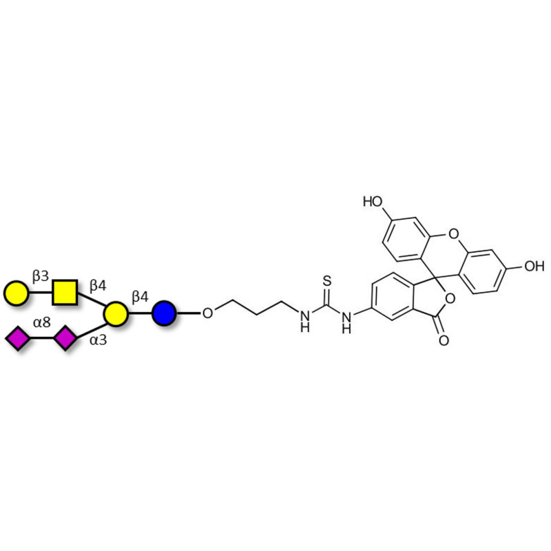 Glycan structure: Galβ1-3GalNAcβ1-4(Neu5Acα2-8Neu5Acα2-3)Galβ1-4Glc-O-(CH2)3-NH-CS-NH-Fluorescein