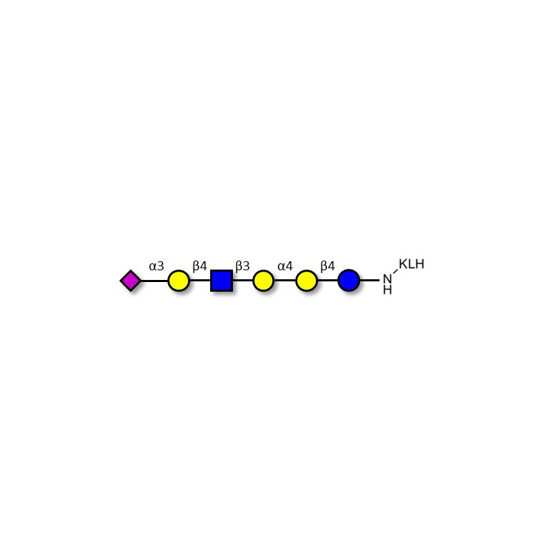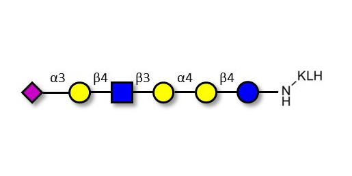 Glycan structure: Neu5Acα2-3Galβ1-4GlcNAcβ1-3Galα1-4Galβ1-4Glc-KLH
